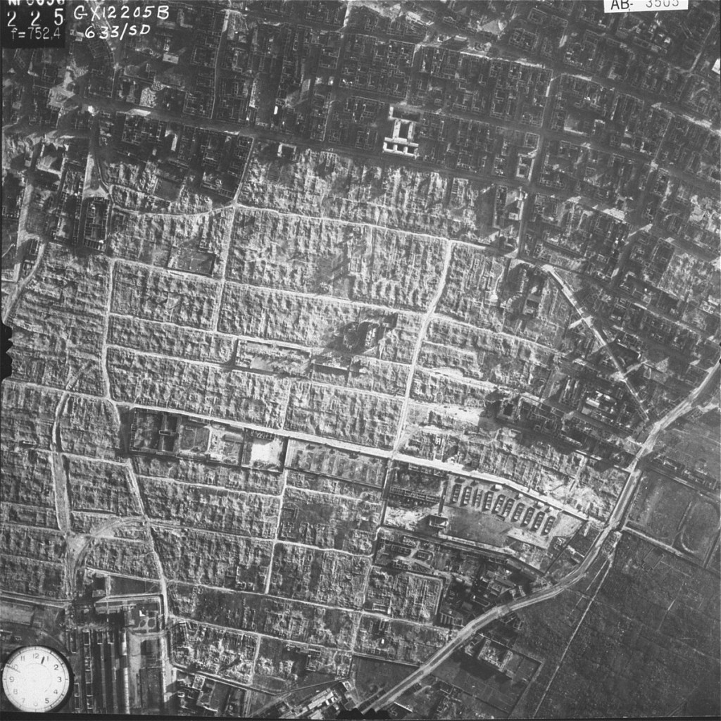 An aerial photo showing the destruction of the Warsaw ghetto. After May 16, 1943. USHMM