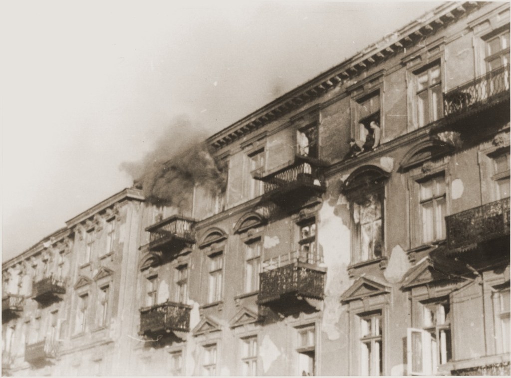 Brave Jewish men ready to jump and commit suicide rather than being captured by the German murderers. April 22, 1943. USHMM
