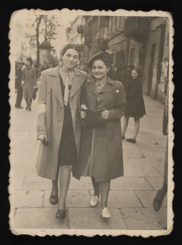 Two Jewish girls: Gina Tabaczynska -right-, b. 1925, and Hanka Birenbaum) in the Warsaw ghetto. 1940–1943. Gina survived the Holocaust. USHMM