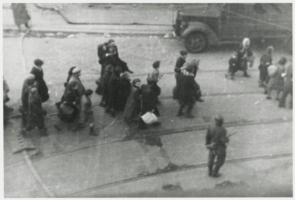 Jewish men, women and children captured after the Warsaw ghetto uprising being herded down Nowolipie street to the Umschlagplatz for deportation. April 19–May 16, 1943. USHMM