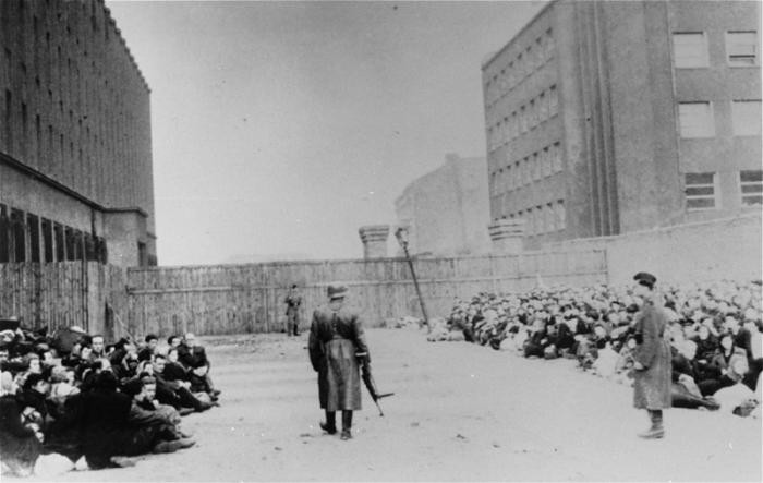Jewish men, women and adolescents captured by German pigs being held next to the ghetto wall before being sent to the Umschlagplatz for deportation. Warsaw ghetto uprising. April 19–May 16, 1943. USHMM
