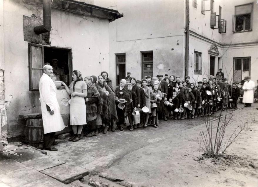 Jewish men, women and children waiting in line for food. Nalewki street, 33. Warsaw ghetto. Yad Vashem