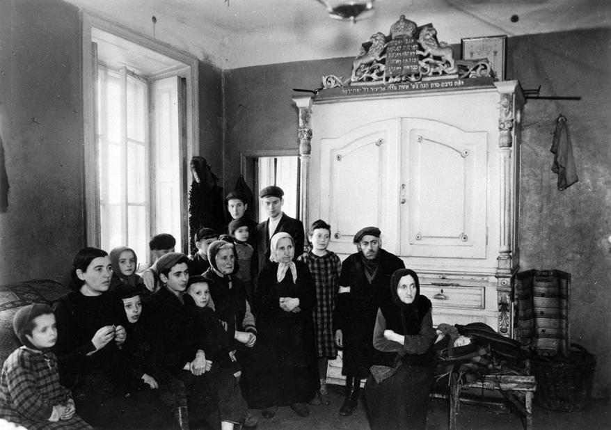 Jewish men, women and children living inside the synagogue of Nalewki street, 37. Warsaw ghetto. Yad Vashem