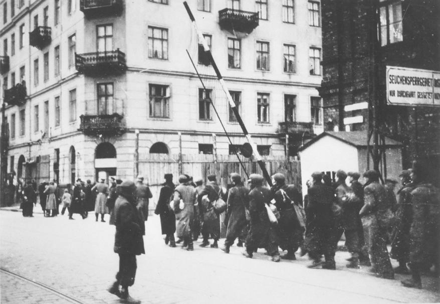 Jewish men, women and children being sealed into the ghetto by the Germans. Zelezny street. 1940. Yad Vashem