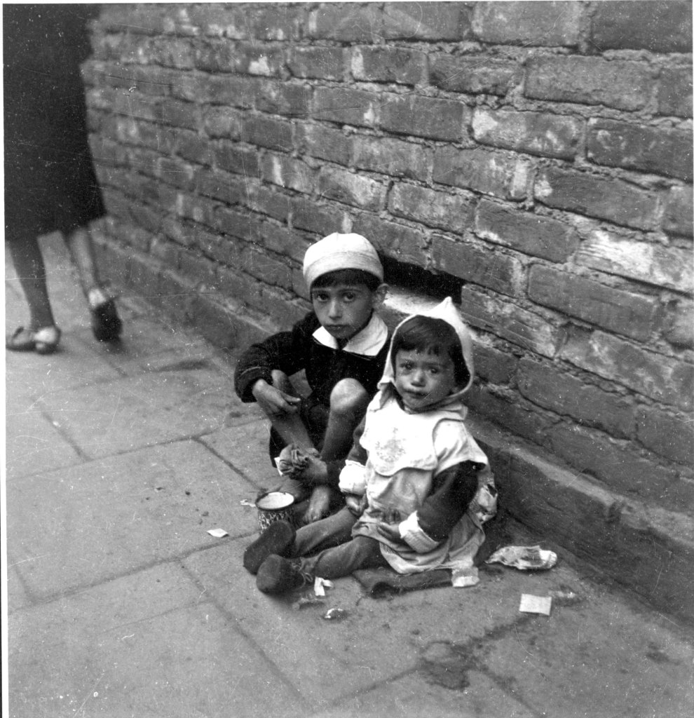 Two starving Jewish children in the Warsaw ghetto (1940–1943). USHMM