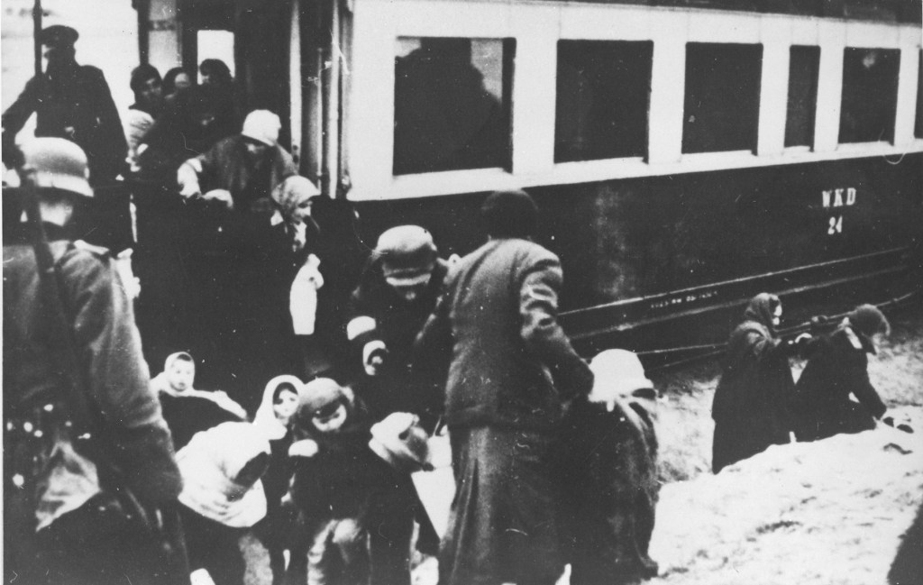 Jewish men, women and children from other parts of the Generalgouvernement arriving in a train/tram for passengers (not a freight car) to the Warsaw ghetto. USHMM
