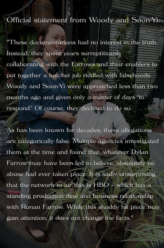 What strikes me is the huge fear that (good) journalists seem to have to openly declare that the whole “case” against Woody is a prefabricated lie meticulously prepared by the Farrow clan. At best, you get some articles denouncing the one-sided approach that the HBO-Dick-Ziering-Farrow production has, but that’s not it. The whole production is based on a non-event. And that should be said out loud. Why are people in the US so afraid of saying out loud that Woody has been falsely accused? Woody is a victim of a false accusation. And that’s a crime. If you believe a false victim, you are accusing an innocent man. And to accuse an innocent man is a crime. Period.