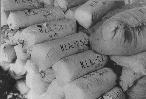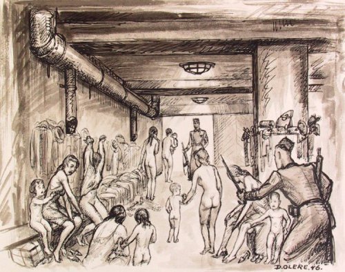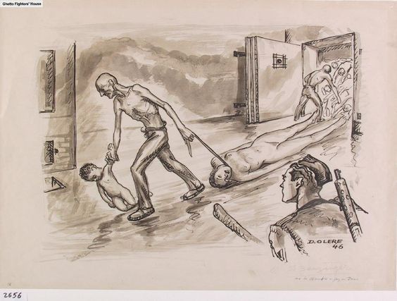 A Jewish mother hugging her little daughter and other Jewish victims being massacred by Einsatzgruppen. The original photo reads: “Ukraine 1942 – Judenaktion in Iwangorod”. Ukraine, 1942. Yad VashemThree homeless Jewish children in the Warsaw ghetto (1941–1943)Jewish children from the Łódź ghetto being assembled for deportation to Chełmno, 5-12 September, 1942. USHMMDeportation of Jewish men, women and children from Zamość (German-occupied Poland) to Bełżec, April 1942. Jewish women and children from the Szydłowiec ghetto (German-occupied Poland) being deported to Treblinka, September 23, 1942. Yad Vashem. Two little Lithuanian Jewish boys: Emanuel Rosenthal (b. 1942, 2 years old) and Avram Rosenthal (b. 1939; 5 years old) in the Kovno ghetto, 1944. They were murdered by the Germans in the Kinder Aktion of March 27-28, 1944. Photo by Holocaust survivor George Kadish (1910–1997). USHMMThe Gate of Death, entrance to Auschwitz-Birkenau. Stanisław Mucha. Auschwitz-Birkenau State MuseumArrival of a transport of Hungarian Jewish men, women and children. Auschwitz-Birkenau, May-June 1944. The Auschwitz Album. Yad VashemHungarian Jewish women and children waiting for their “turn” to the gas chamber (grove closest to the crematorium). Auschwitz-Birkenau, May-June 1944. The Auschwitz Album. Yad VashemAn old Hungarian Jewish woman carrying a baby in her arms and three other Jewish children walking towards the gas chamber. Auschwitz-Birkenau, May-June 1944. The Auschwitz Album. Yad VashemDavid Olère. Dans la salle de déshabillage, 1946.David Olère. Après le gazage, 1946.Shoes from victims. Auschwitz, after the liberation. Auschwitz-Birkenau State MuseumHair from victims. Auschwitz, after the liberation. USHMMGlasses from victims. Auschwitz, after the liberation. USHMMTallitot from Jewish victims. Auschwitz, after the liberation. USHMM
